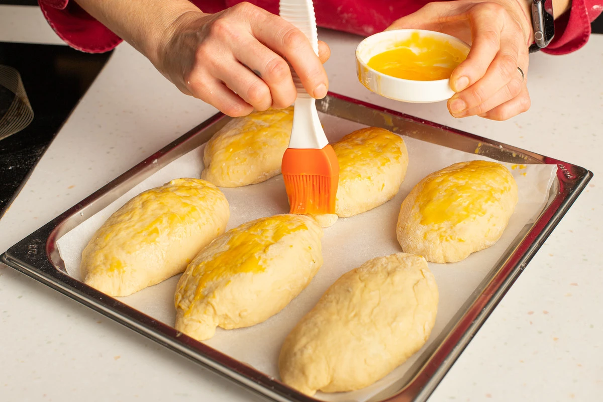 Выложите пирожки на противень. Смажьте оставшимся сырым яйцом и выпекайте около 25 минут при 180 ℃ до золотистости.