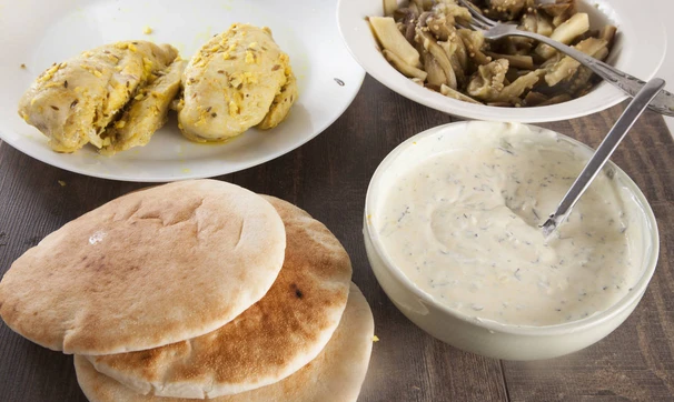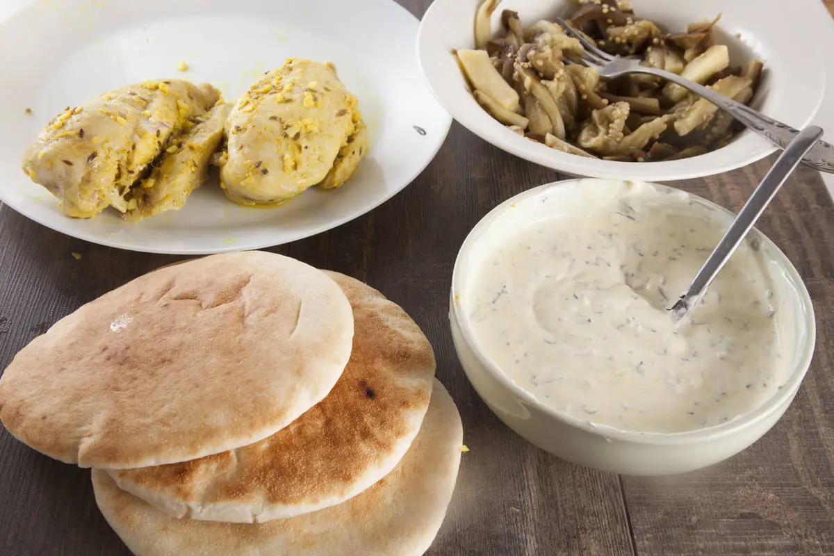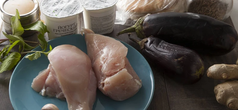 Ближневосточные традиции уличной еды — это что-то! Смесь ароматов специй, жареного на углях мяса, пряных трав, все это конечно невозможно повторить дома в точности, но попытаться однозначно стоит. В этом варианте используется диетическое мясо куриной грудки, но блюдо от этого совершенно не проигрывает — мясо получается сочным, а соус и нежные печеные баклажаны его отлично дополняют!