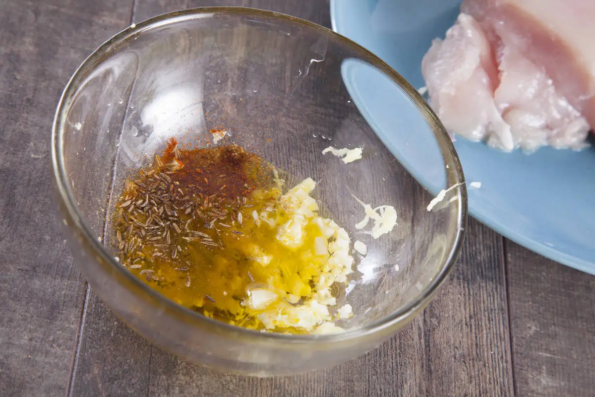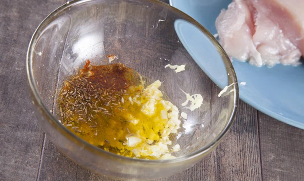 Для маринада взбейте оливковое масло с лимонным соком вилкой, добавьте специи, соль и измельченные чеснок и имбирь.