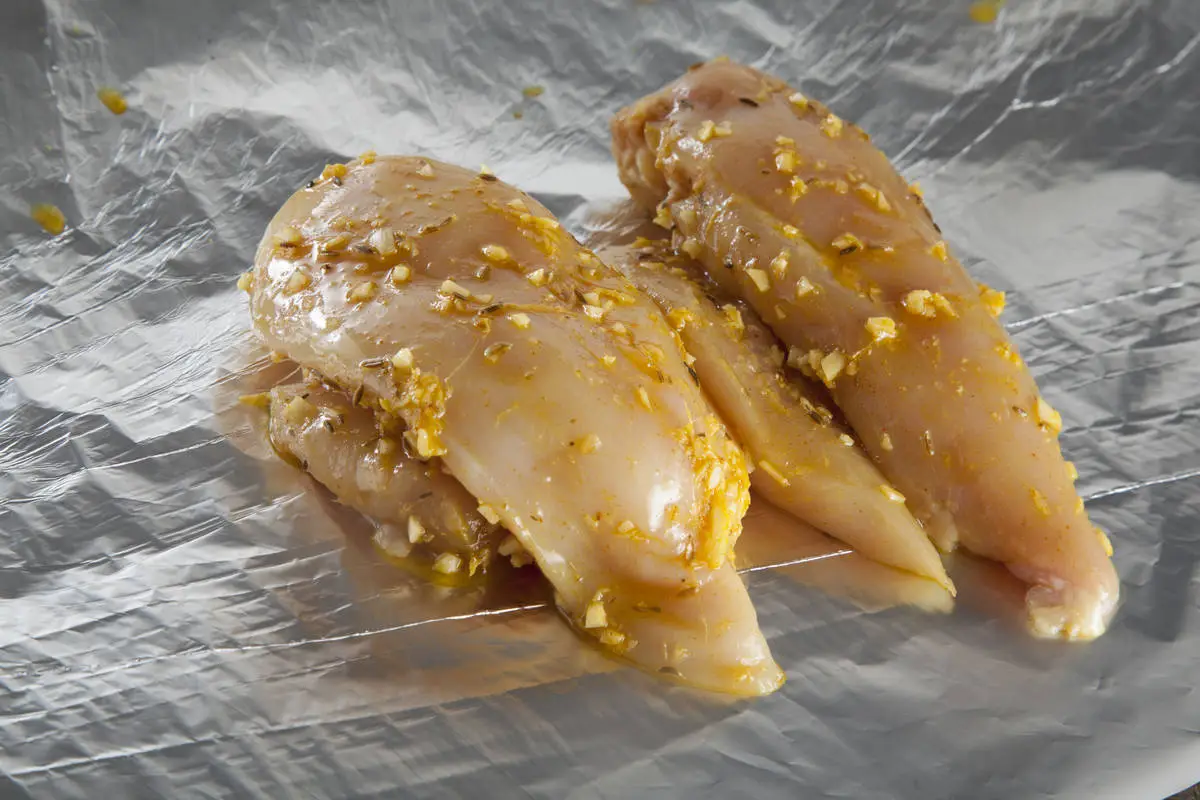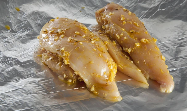 Обмажьте куриные грудки получившейся смесью, заверните в фольгу и оставьте на 15 минут, затем запеките в разогретой духовке до готовности — 15-20 минут.