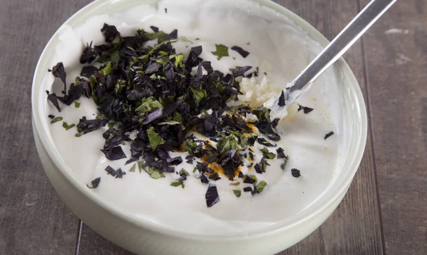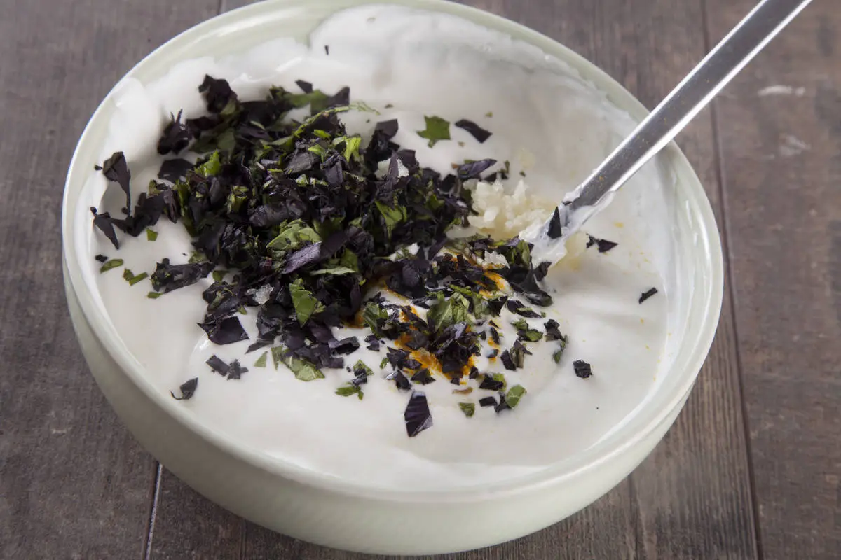 В греческий йогурт добавьте измельченный чеснок, порезанную зелень, куркуму, соль и перец, перемешайте, половину соуса смешайте с баклажанами.