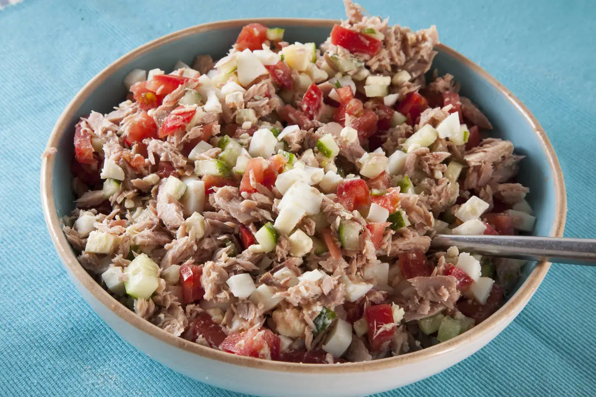 Тунца выньте из масла, выложите в тарелку и разомните вилкой, смешайте все ингредиенты, заправьте салат майонезом, посолите по вкусу.