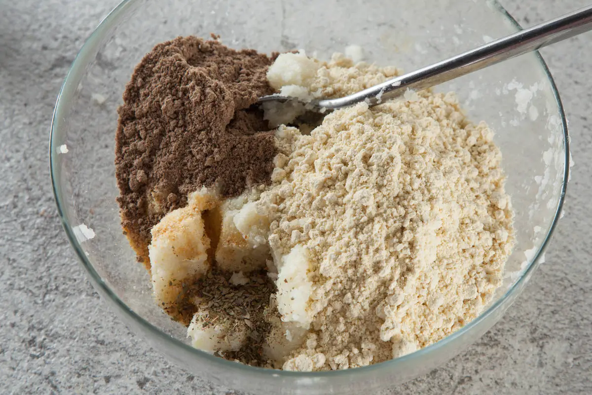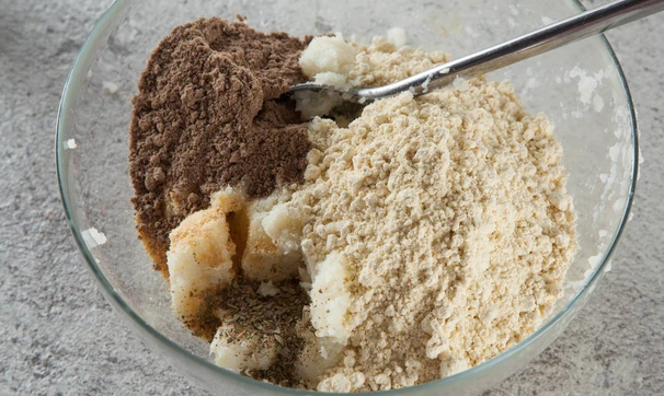В отжатую массу добавьте муку, льняную кашу, специи и масло.