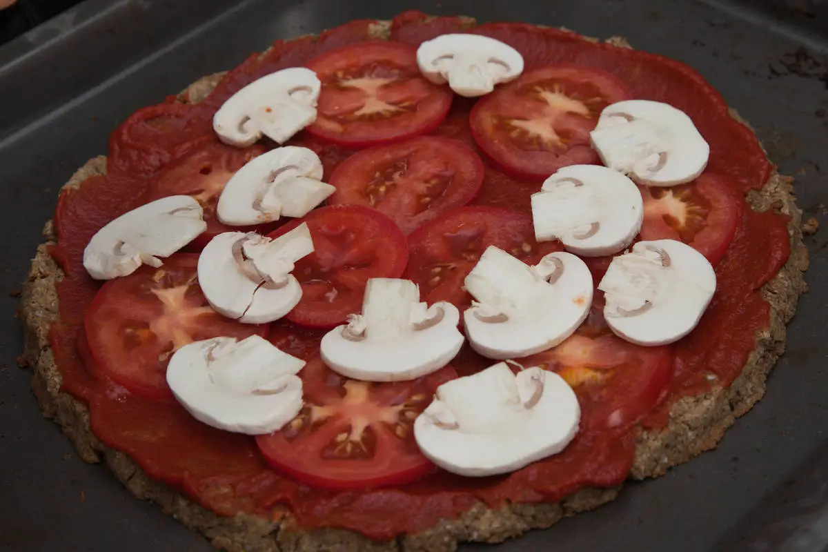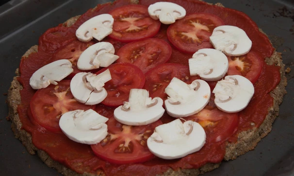 На подвыпеченную основу распределите томатную пасту, шампиньоны, кольца помидоров, мини-кукурузу, сбрызните маслом. При желании сверху можно потереть любимый сыр. Выпекайте еще 20-30 минут, поглядывая за краями основы – они не должны подгореть.