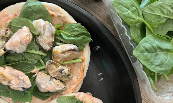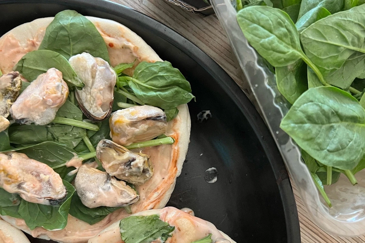 Выложите на питу листья шпината, затем мидии (или любые другие морепродукты).