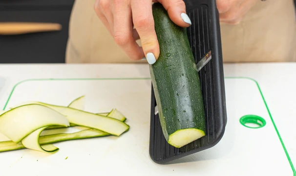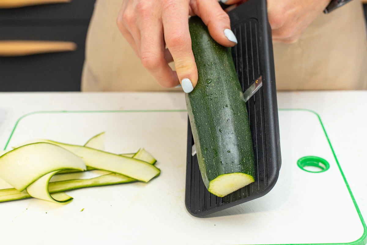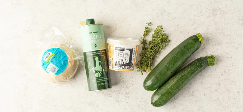 Полностью разморозьте тесто. Цукини помойте, отрежьте плодоножки. Нарежьте вдоль слайсером или овощечисткой на тонкие ленты.
