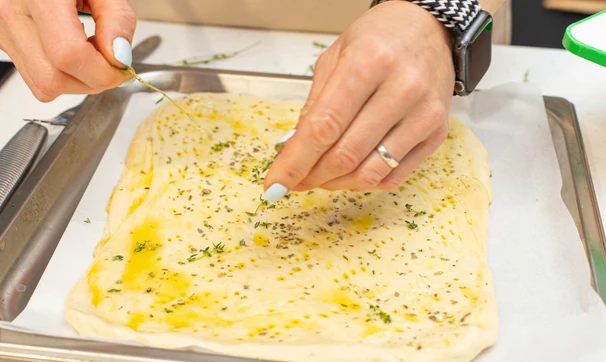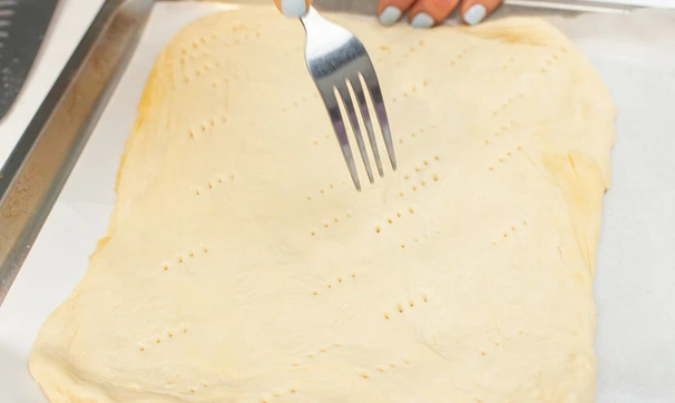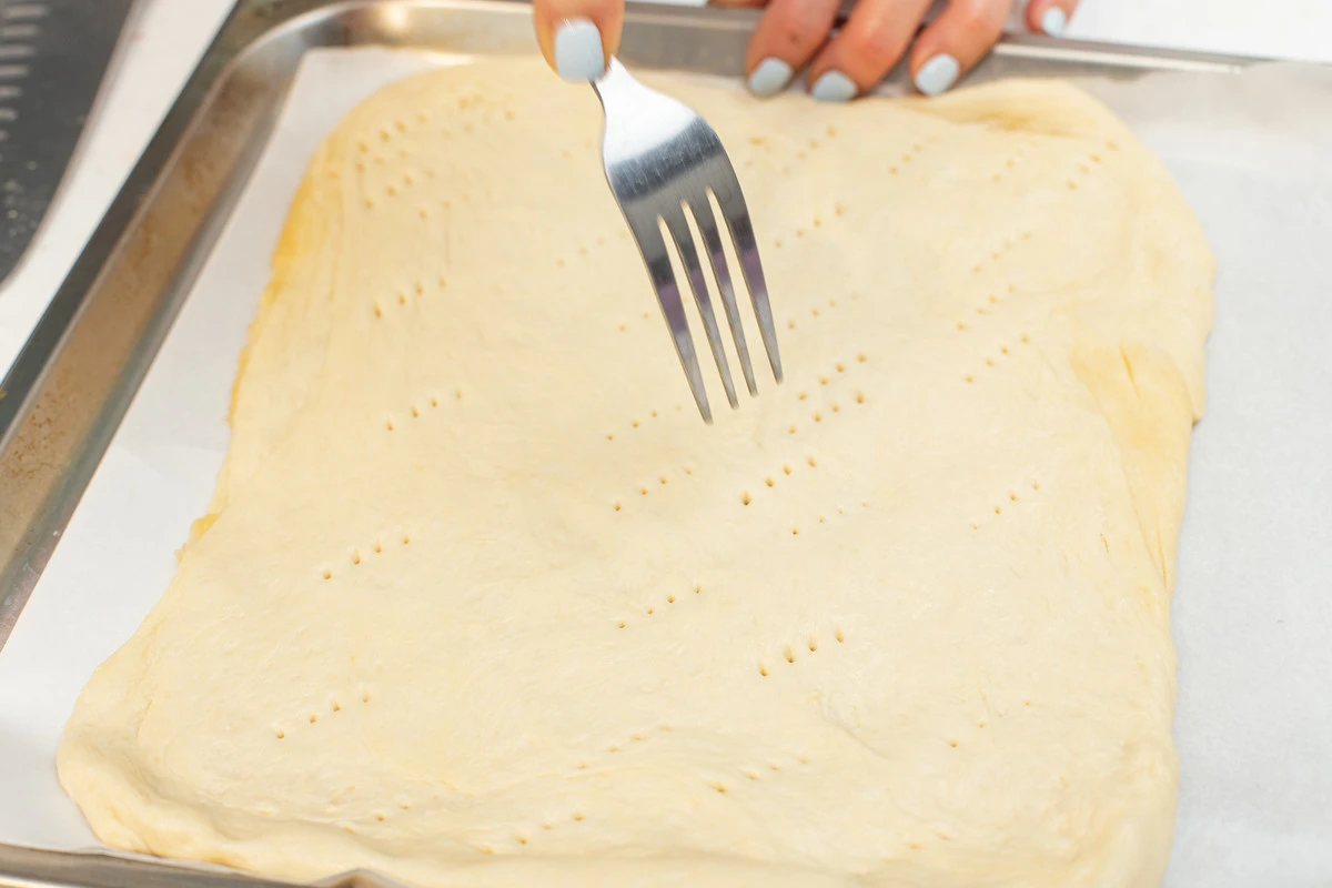 Застелите противень пергаментом для выпечки. Руками сформируйте пласт теста по размеру противня (толщина пласта должна быть примерно 0,5 см). Часто наколите тесто вилкой.