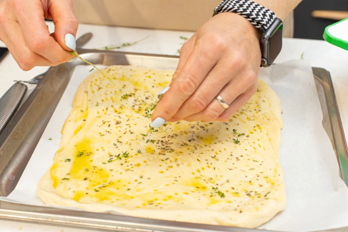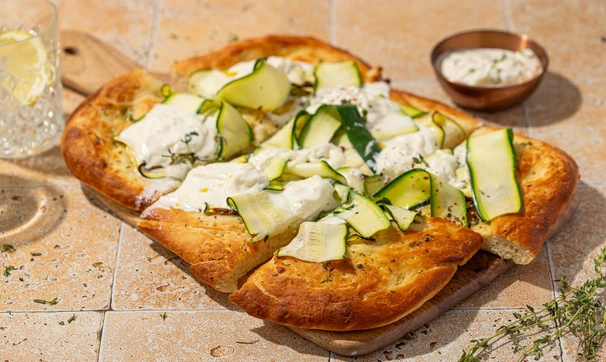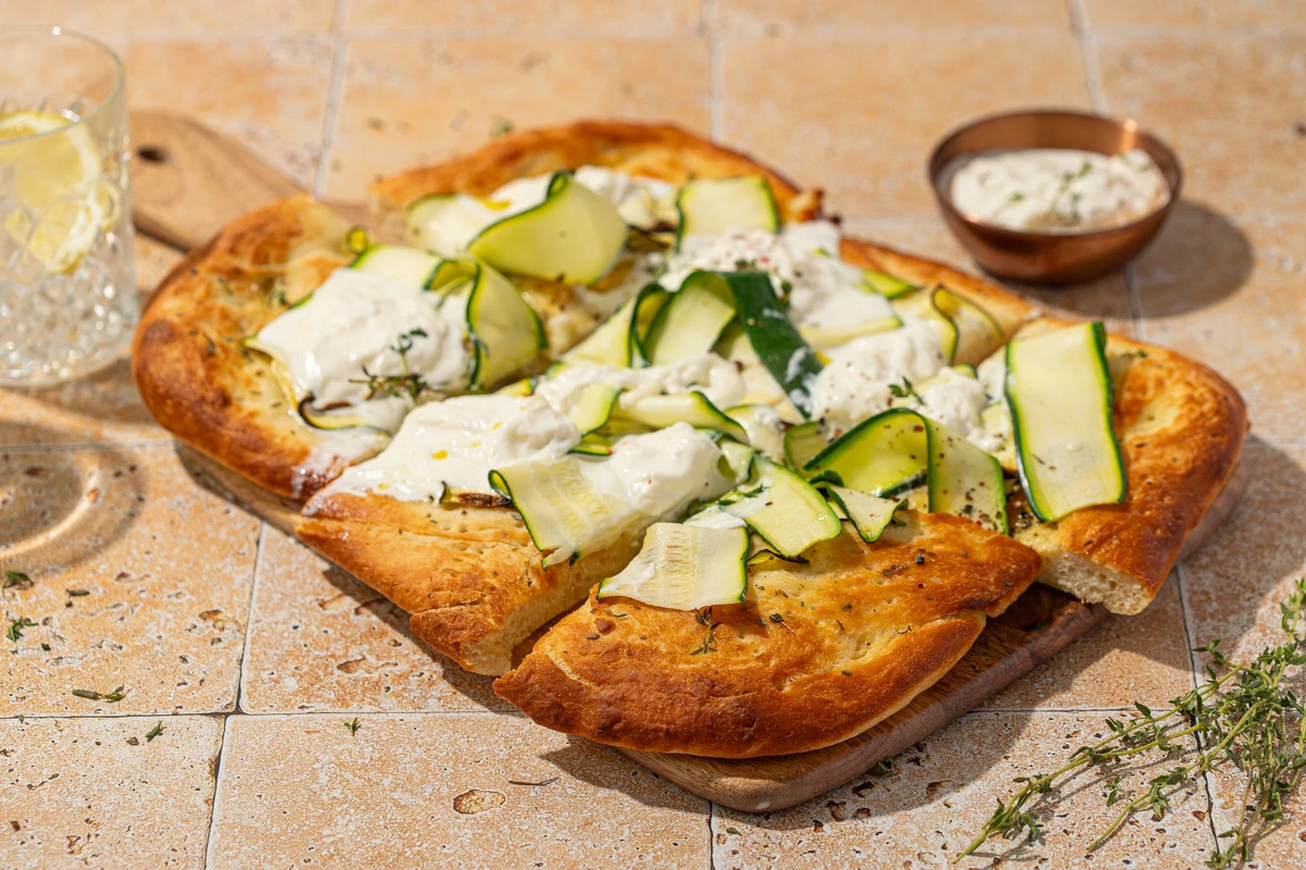 Смажьте тесто оливковым маслом. Равномерно посыпьте листьями свежего тимьяна, щепоткой орегано и/или других любимых итальянских специй, посолите и выложите сверху половину лент цукини. Выпекайте пиццу в разогретой до 220-230 °C духовке на режиме верх-низ в течение примерно 10 минут до румяности.
