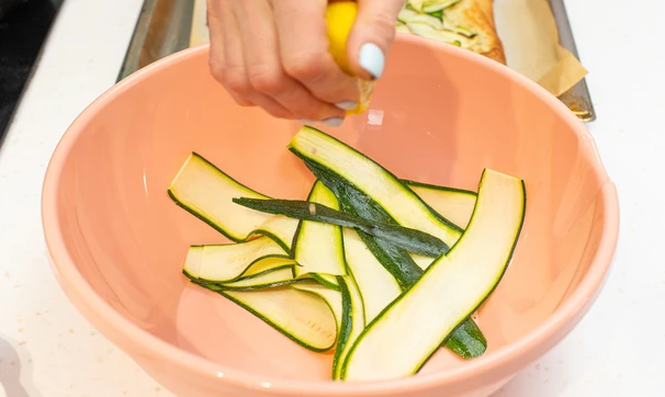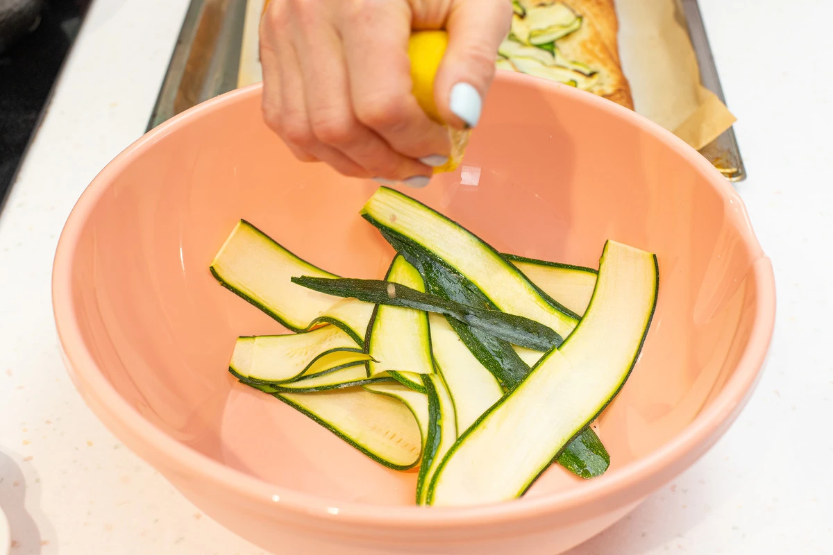 Пока выпекается пицца, залейте оставшиеся ленты цукини лимонным соком (1 ч. ложка или по вкусу), слегка перемешайте, чтобы сок распределился. Оставьте мариноваться на 10 минут.
