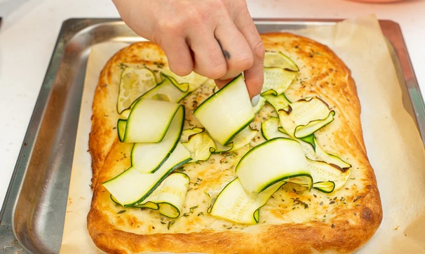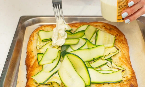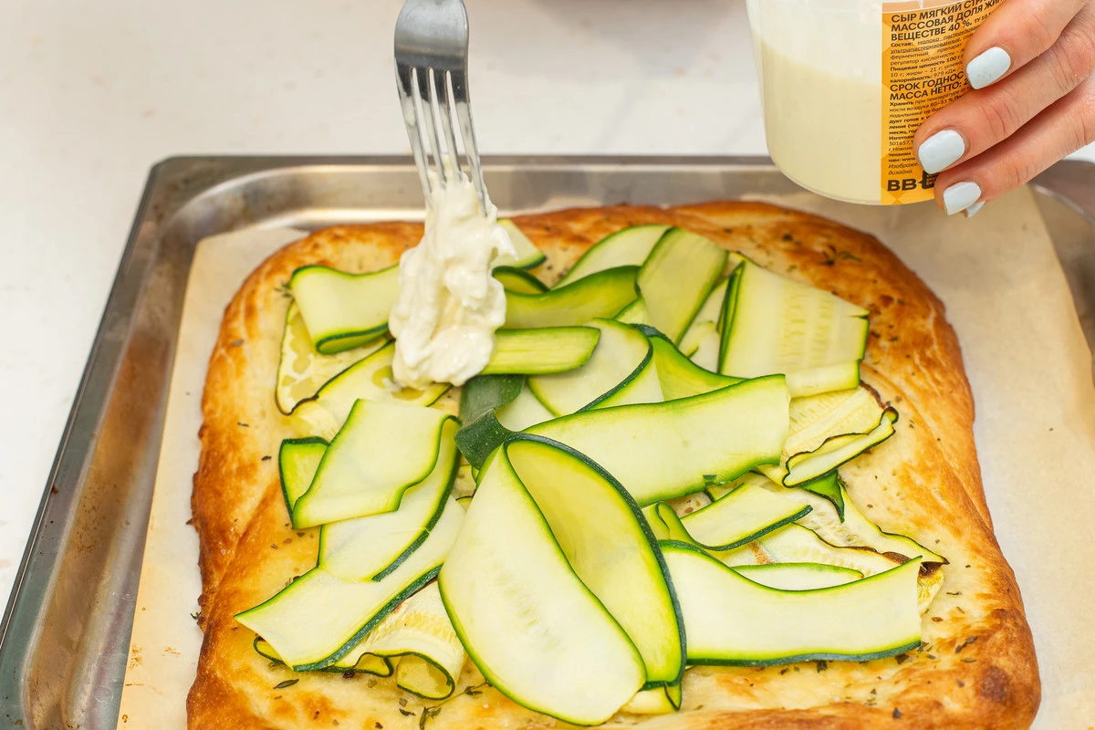 Достаньте пиццу из духовки, красиво выложите на неё маринованные слайсы цукини и снова поставьте в духовку прогреть всё вместе при 220-230 °C на 1-2 минуты. Цукини должны «запотеть».