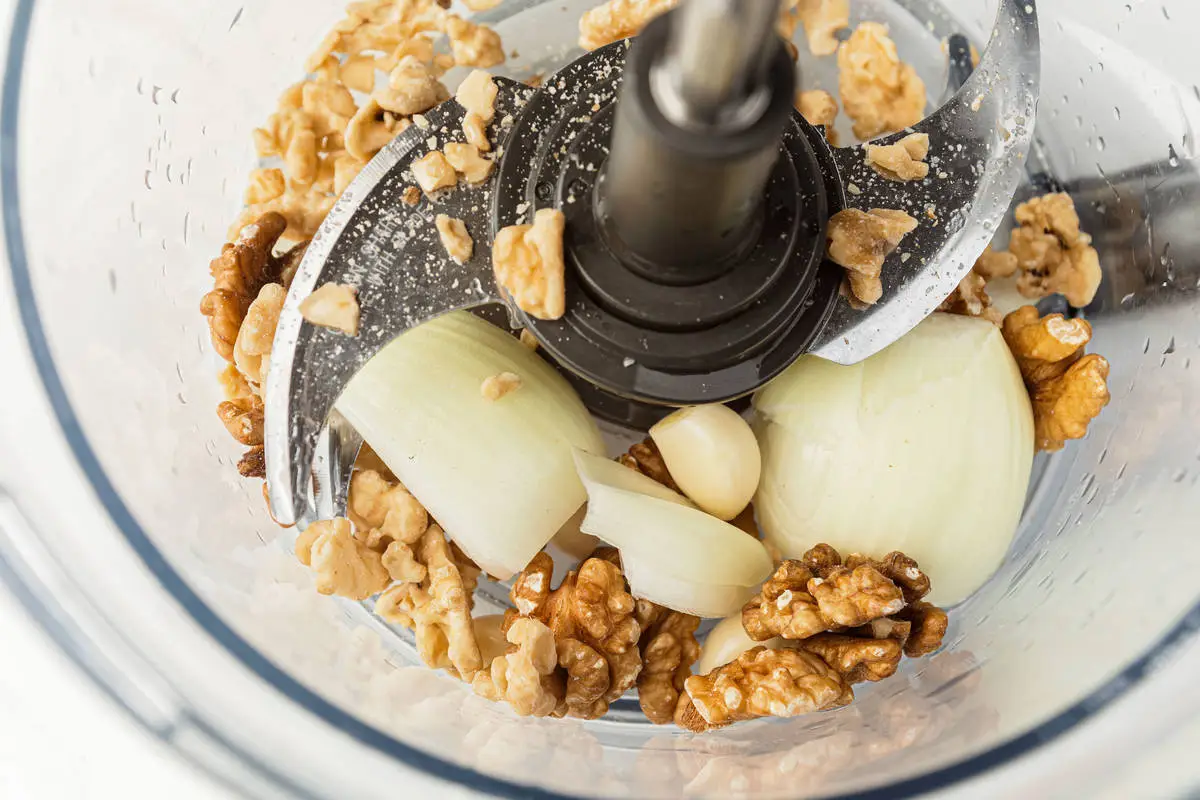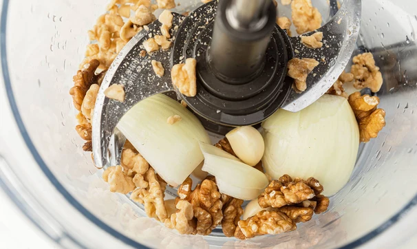 Орехи, очищенные чеснок и лук, уксус, соль и хмели-сунели пробейте в блендере в крошку.