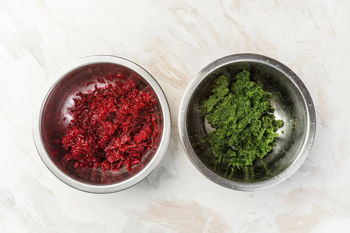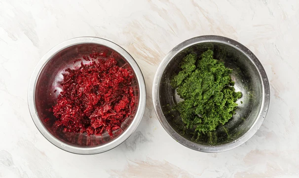Заранее размороженный шпинат (достаточно 30 минут при комнатной температуре) тщательно отожмите от лишней влаги, выложите в мисочку и добавьте половину ореховой смеси, перемешайте. Свёклу измельчите на тёрке, выложите в другую мисочку и соедините с оставшейся половиной орехов, перемешайте. Попробуйте обе смеси, при необходимости добавьте ещё соли или уксуса.
