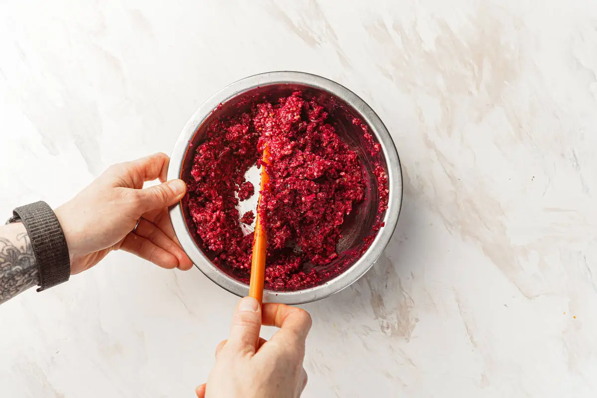 В обе смеси добавьте по 1 ст. ложке растительного масла. Масло можно выбрать любое на ваш вкус – оливковое, подсолнечное, а может, даже масло авокадо. Слепите аккуратные «котлетки» двух цветов и уберите в холодильник на полчаса-час.