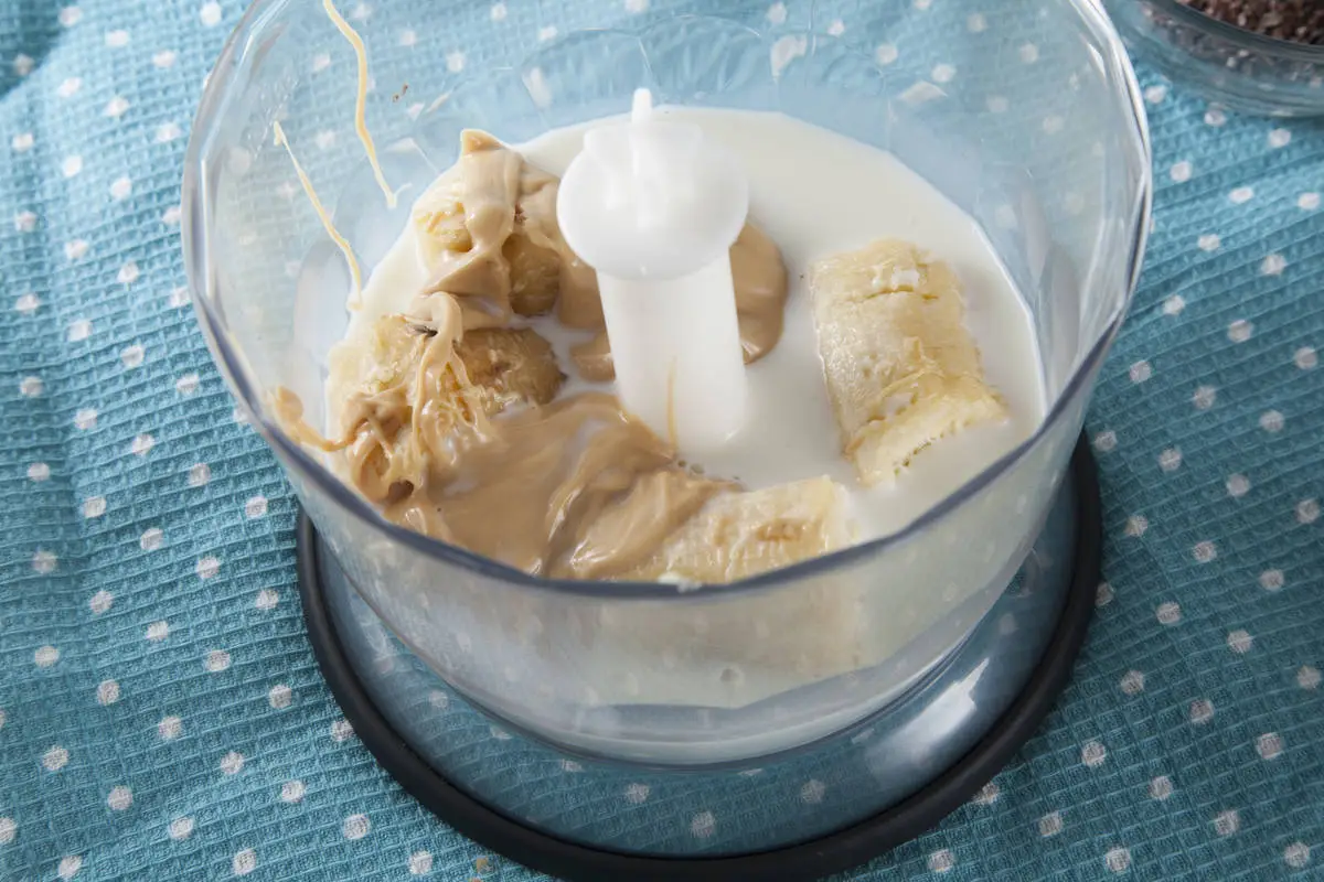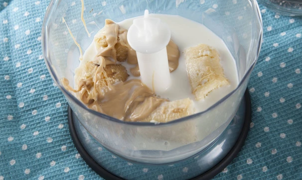 Для соуса смешайте в блендере очищенный банан, арахисовую пасту и молоко. Подавайте блины с соусом, посыпав какао-крупкой.