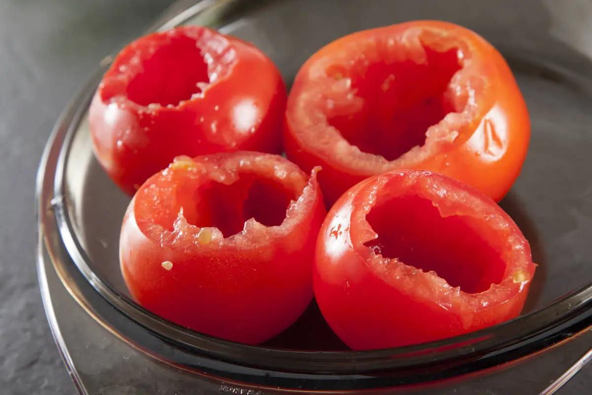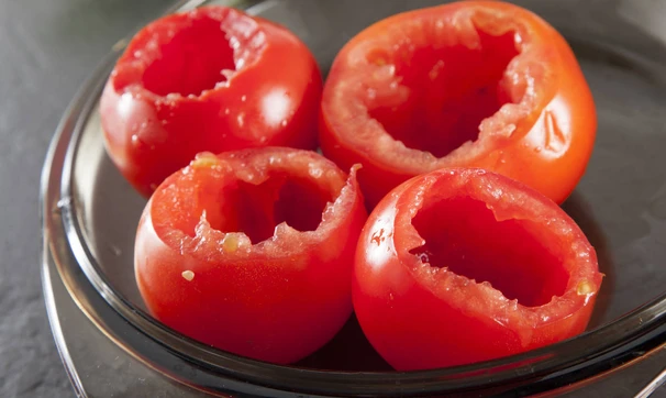 У помидоров срежьте «крышечки» и аккуратно вырежьте мякоть острым ножом, стараясь не повредить стенки, сбрызните оливковым маслом.