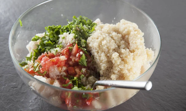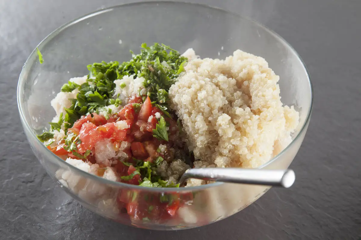 Мякоть мелко порежьте вместе с петрушкой, чеснок измельчите, смешайте с киноа и рыбным фаршем, посолите и поперчите по вкусу.