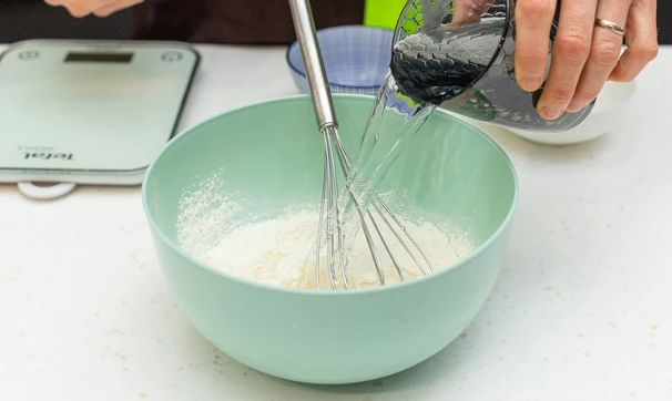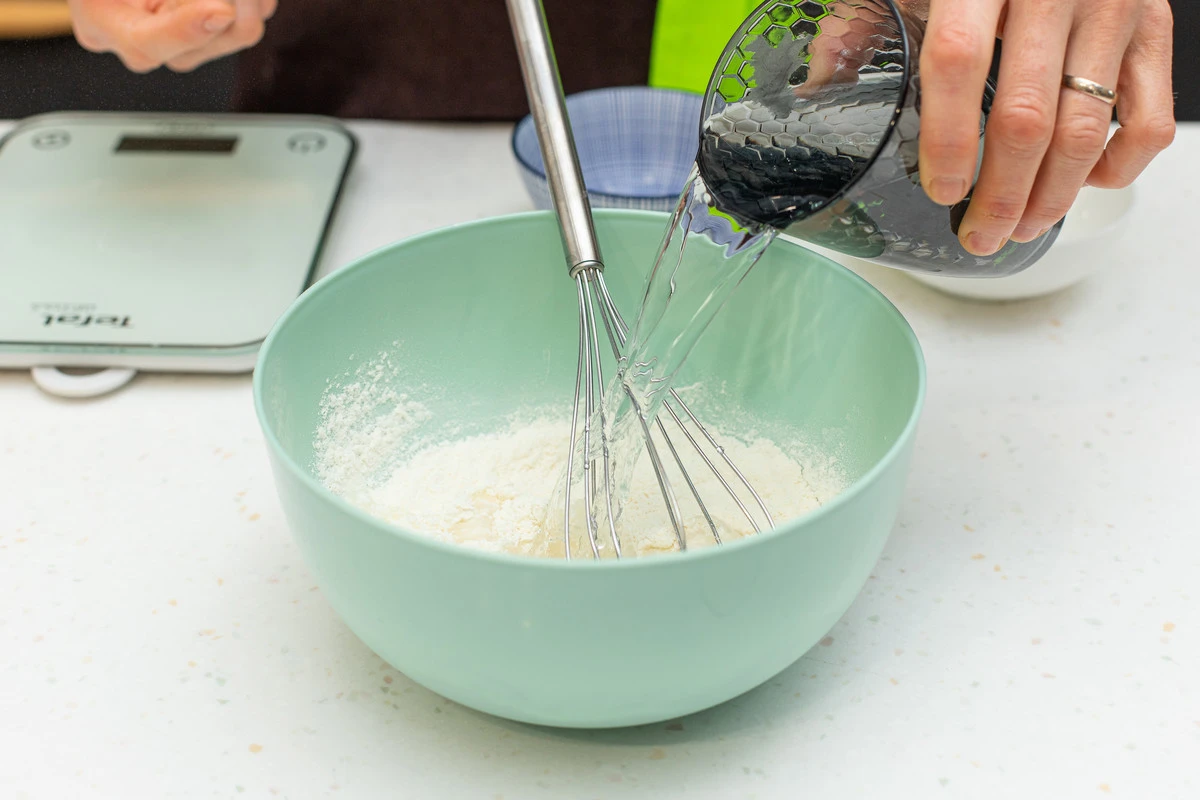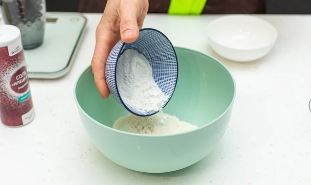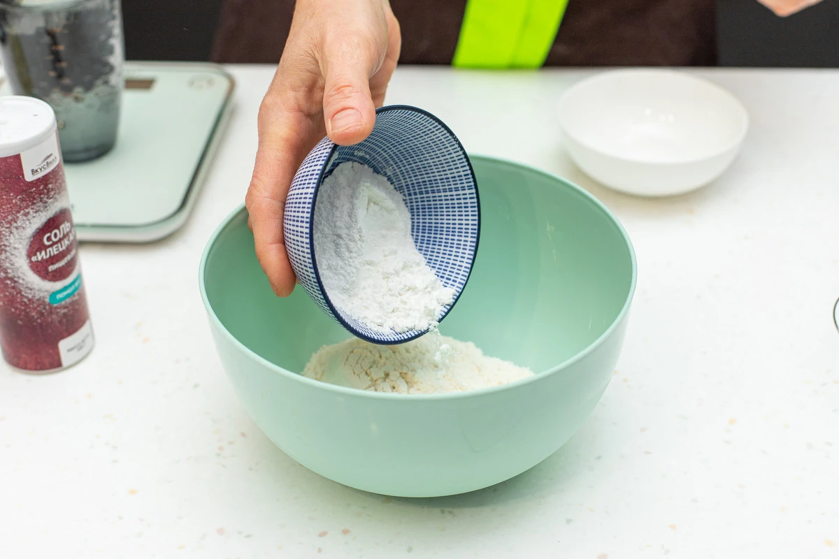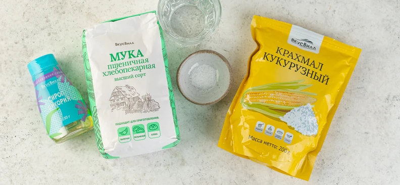 Смешайте муку, крахмал и соль. На этом этапе можно добавить немного сахара по желанию.