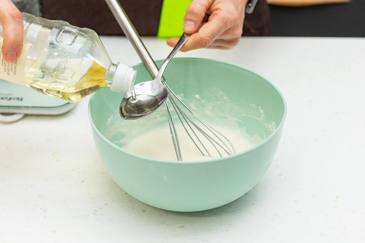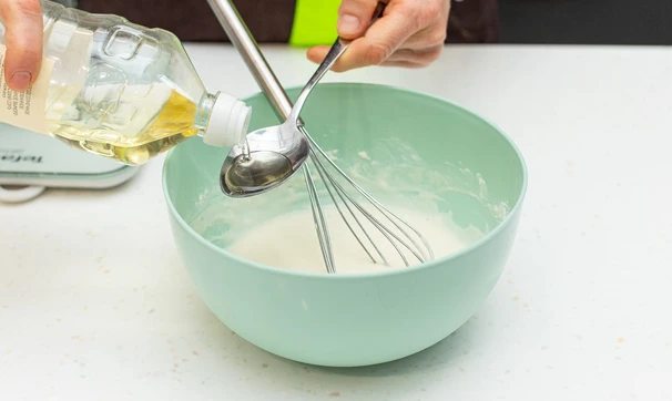 Влейте растительное масло, перемешайте и сразу жарьте.