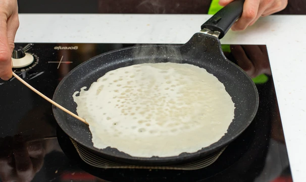 Жарьте блины как обычно — на горячей сковороде. Перед первым блином смажьте сковороду растительным маслом, дальше можно масло не добавлять.