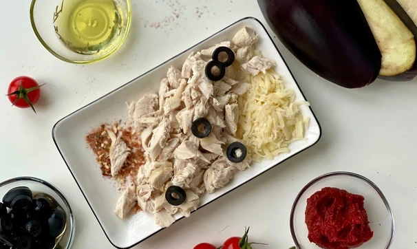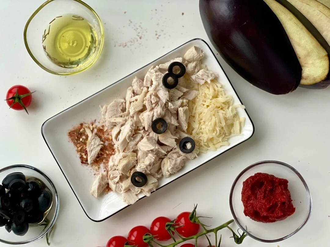 Печёные баклажаны смажьте томатной пастой, посыпьте специями. Затем выложите курицу, тёртый сыр, кольца томатов и маслин.
