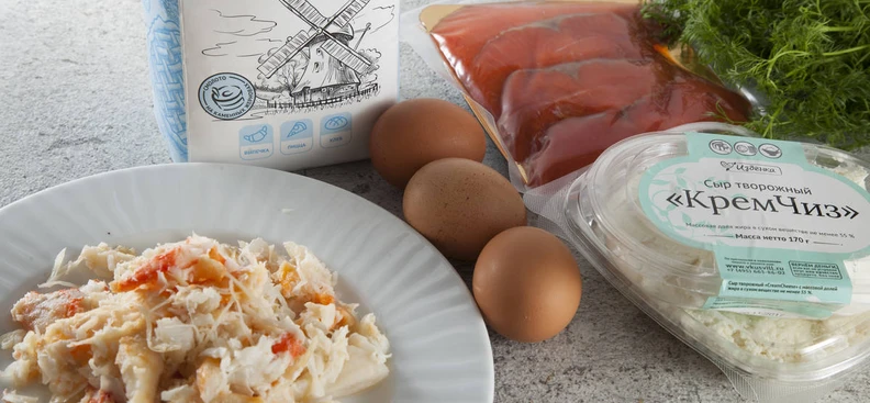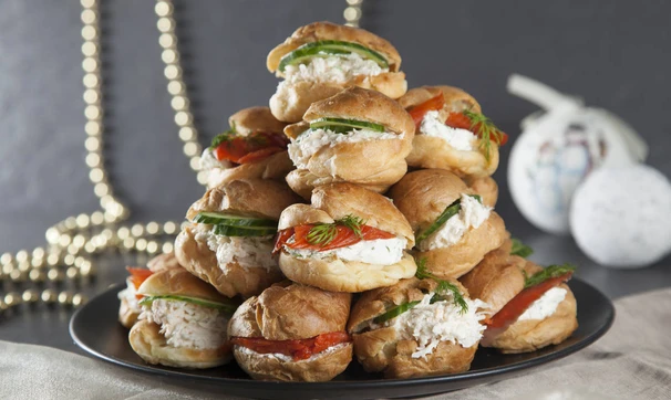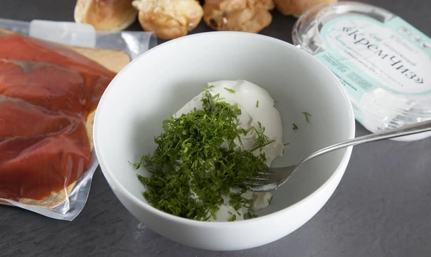 Для начинки с рыбой сыр творожный «кремчиз» смешайте с рубленым укропом, рыбу порежьте тонкими ломтиками. Профитроли разрежьте пополам, внутрь положите около чайной ложки кремчиза, а сверху ломтик рыбы, накройте верхней половинкой.
