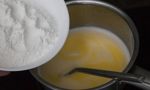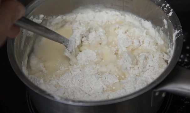 Для заварного теста вскипятите молоко с водой, солью и сливочным маслом.