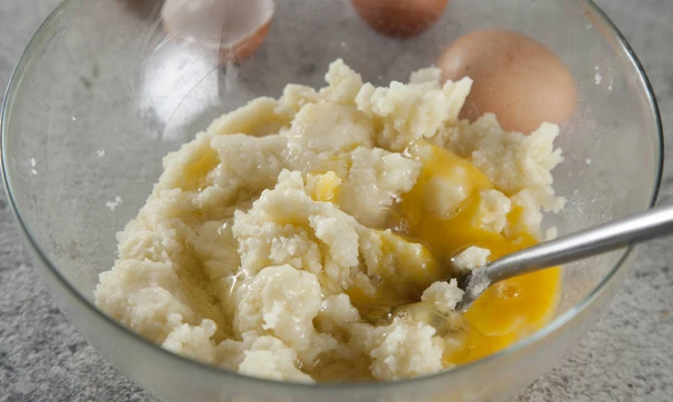В хорошо кипящую жидкость всыпьте сразу всю муку и хорошо размешайте ложкой. Снимите с огня и продолжайте разминать, пока вся масса не слепится в гладкий ком. Выложите ком в миску и дайте остыть до комфортной для руки температуры.