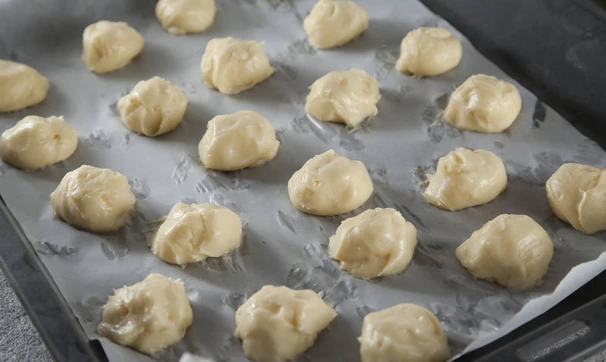 Готовое тесто должно получиться гладким и достаточно густым, чтобы держать форму. Разогрейте духовку до 220 градусов. Противень выстелите бумагой для выпечки и выкладывайте тесто чайной ложкой, оставляя расстояние, чтобы поднявшиеся профитроли не слиплись между собой, мокрым пальцем пригладьте поверхность тестяных шариков. Ставьте противень в горячую духовку, выпекайте при 220 градусах 10 минут, затем убавьте температуру до 190 градусов и пеките до насыщенного золотистого цвета, затем выключите духовку и оставьте остывать с приоткрытой дверцей.