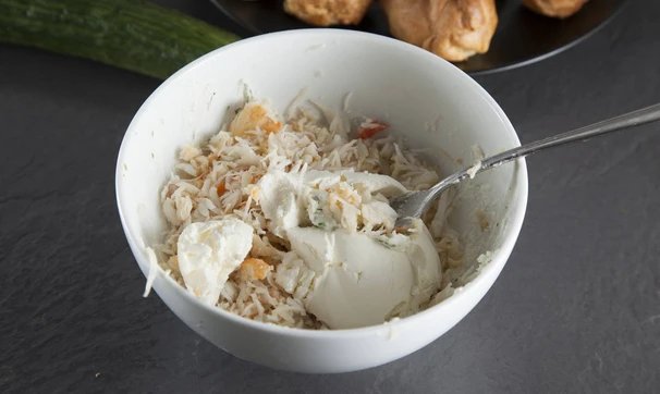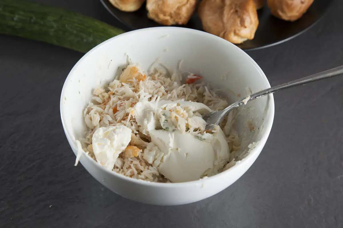 Для крабовой начинки разберите размороженное мясо краба на волокна, удалите хитиновые пластинки, смешайте мясо с кремчизом, огурец нарежьте тонкими кружочками. Начините оставшиеся профитроли крабовой смесью, добавьте хрустящие огуречные ломтики.