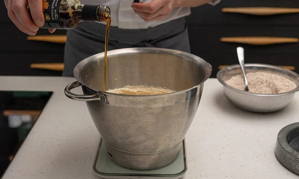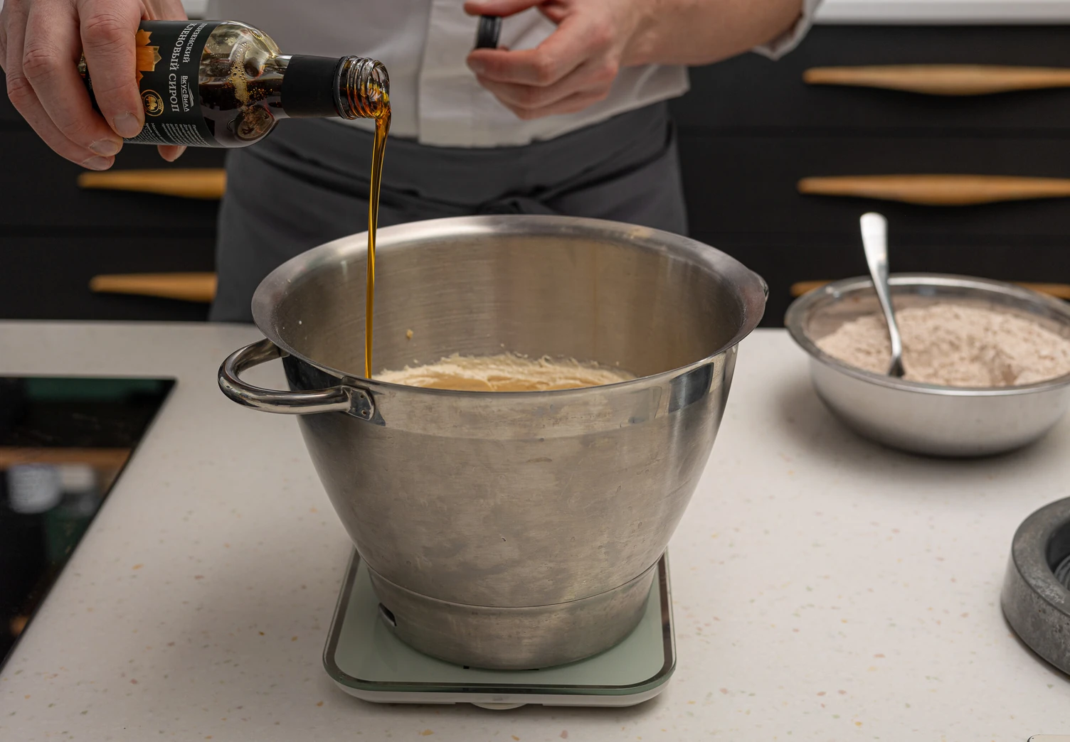 Добавьте к масляно-яичной смеси кленовый сироп, молоко и сыпучие ингредиенты.
