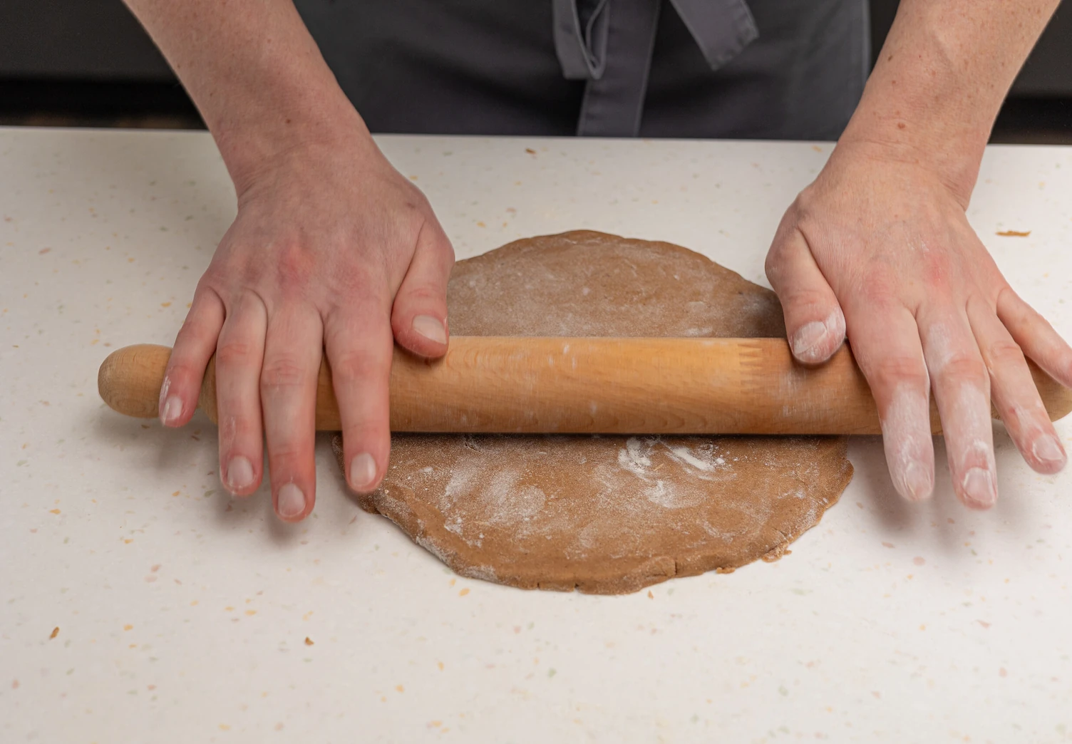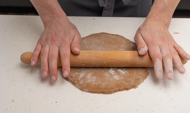 Присыпьте рабочую поверхность мукой и раскатайте на ней тесто в корж толщиной 5 мм.