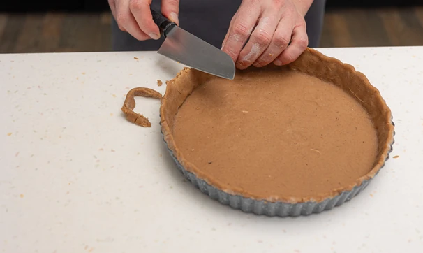 Переложите пласт в форму для тарта с бортиками диаметром 24 см.