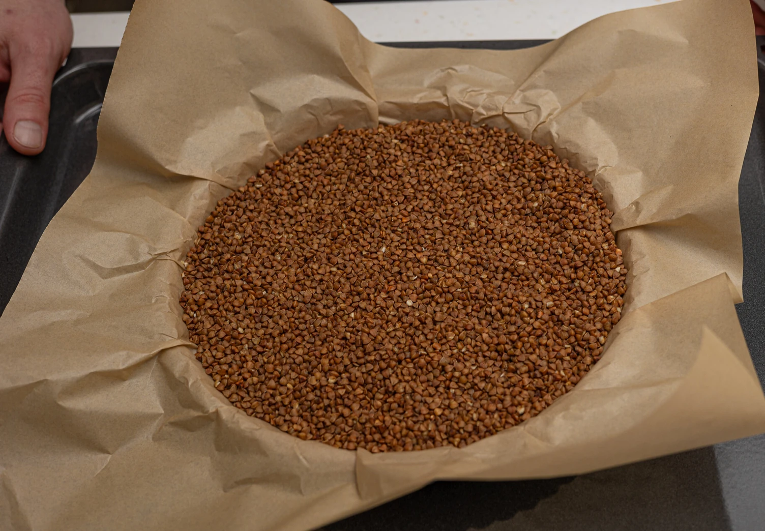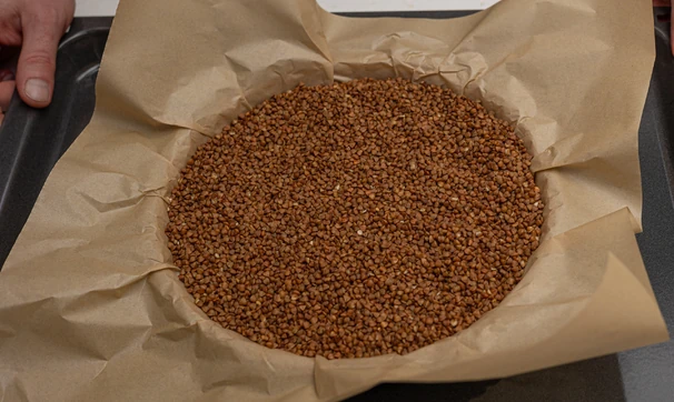 Застелите тесто пергаментом, выложите груз (можно использовать фасоль, гречку или специальные керамические шарики) и выпекайте при 200°C в течение 15 минут. Затем уберите груз, снизьте температуру до 180°C и выпекайте пирог ещё 5 минут.