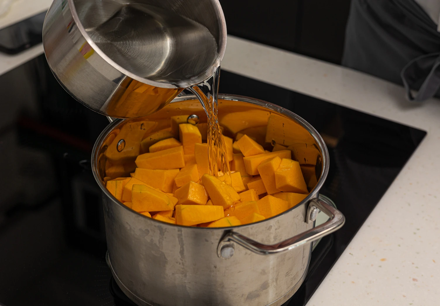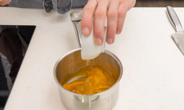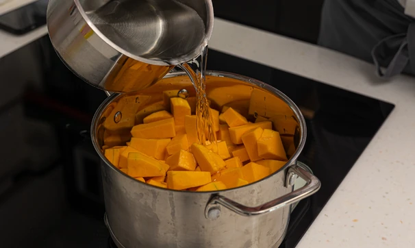Для пюре очищенную тыкву нарежьте кубиками, добавьте сахар, воду, апельсиновый и лимонный соки.