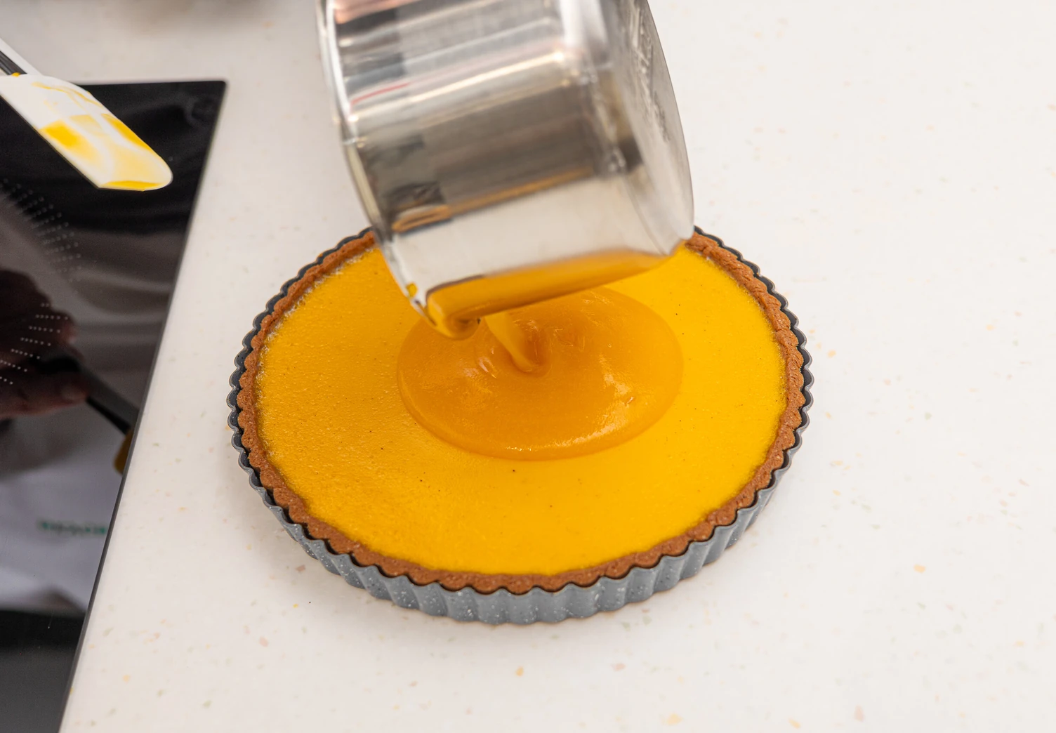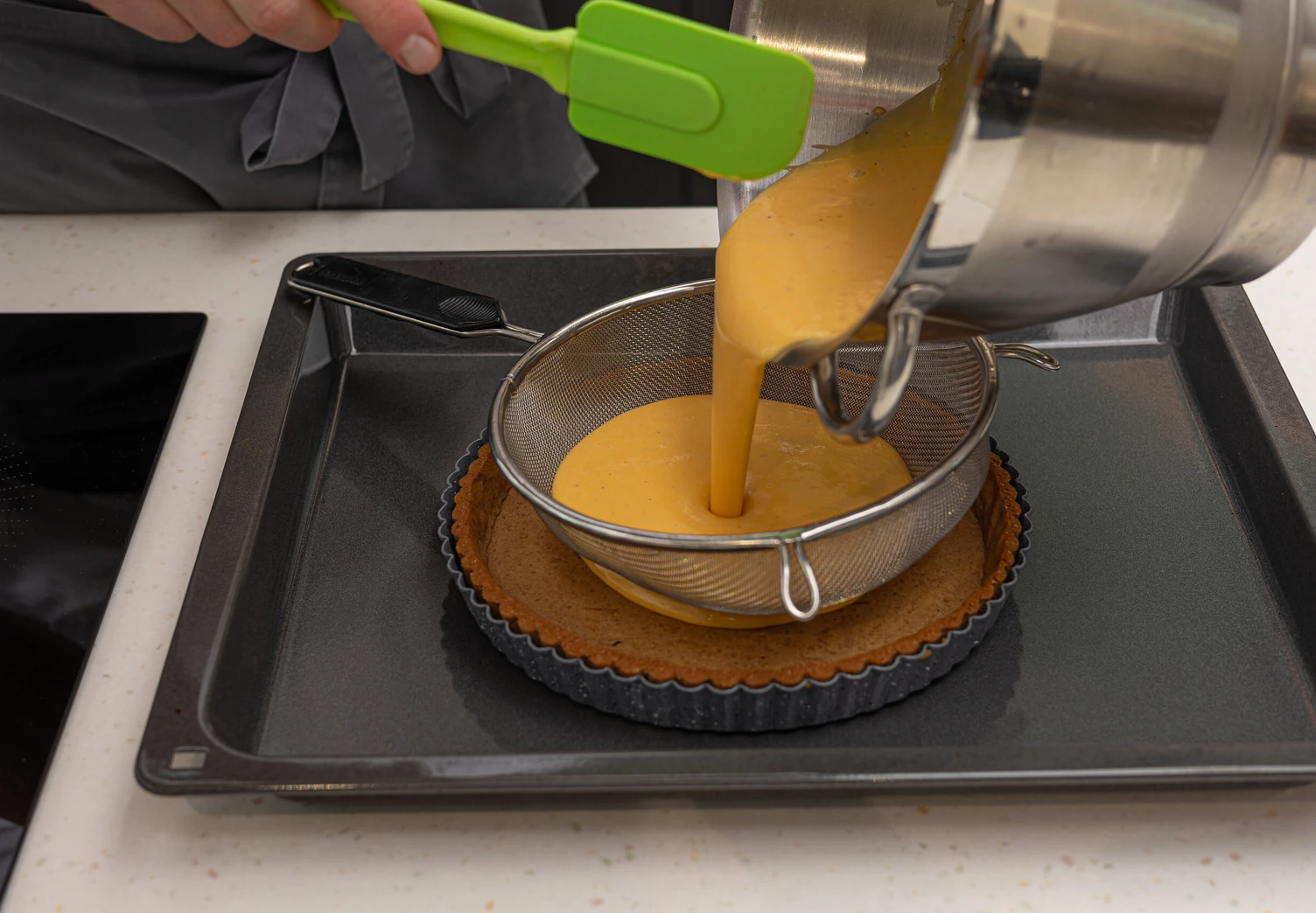 Вылейте начинку через сито на основу и отправьте в духовку, разогретую до 170°C, на 30 минут.