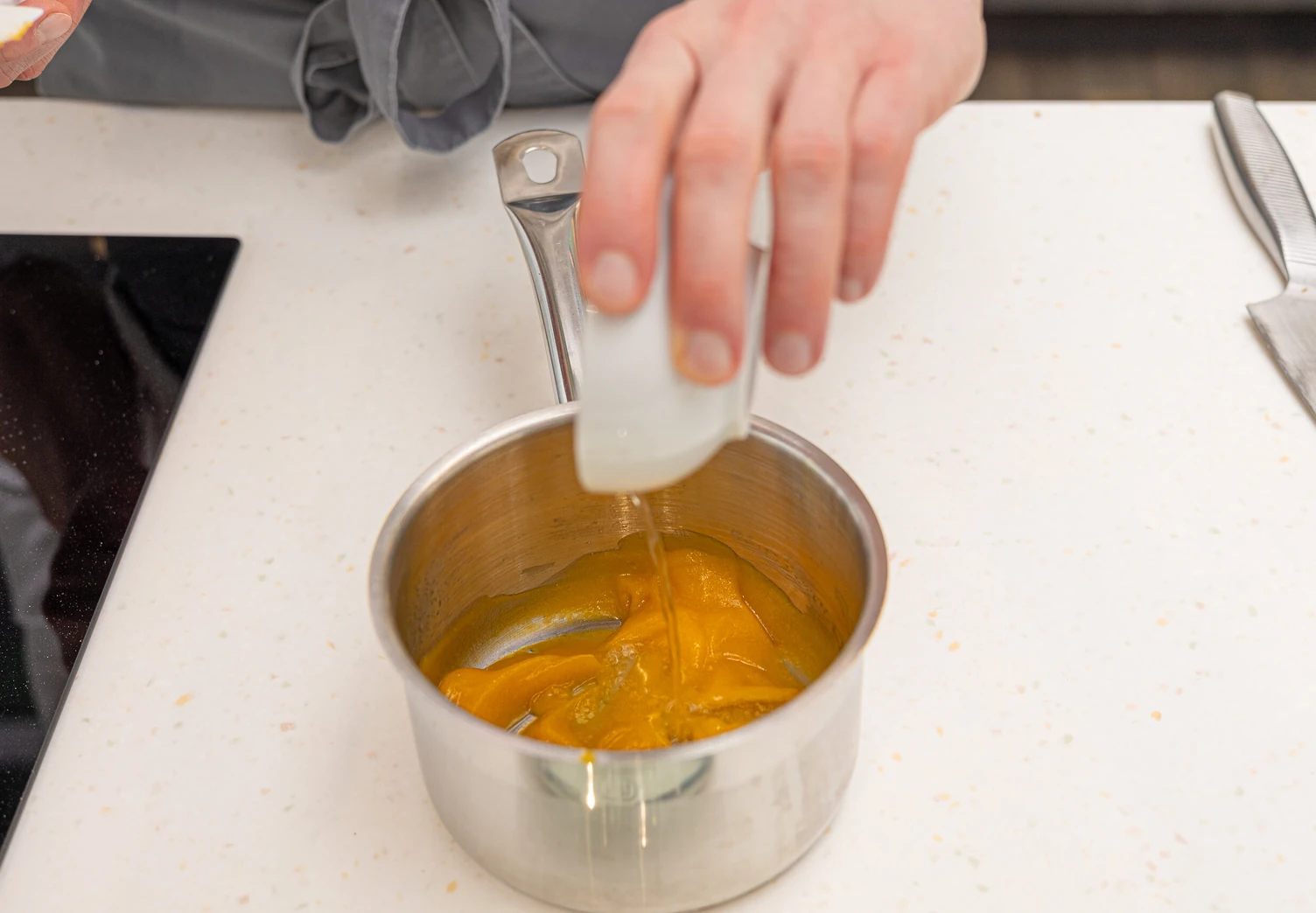 Для желе желатин замочите в холодной воде, тыквенное пюре слегка подогрейте.