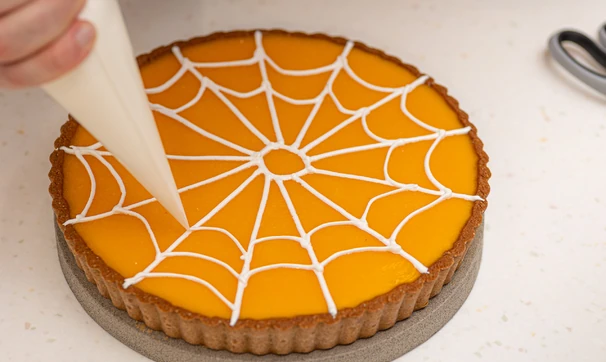Растопите белый шоколад на водяной бане или короткими импульсами по 10-15 секунд в микроволновке. Перелейте в кондитерский мешок и нарисуйте паутинку на поверхности готового пирога.