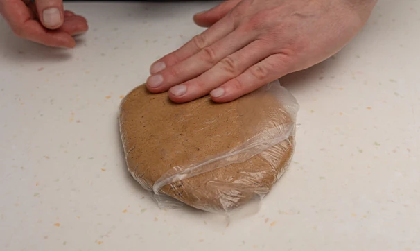 Отделите 350 г, сформируйте толстый пласт, заверните в пищевую плёнку и уберите в холодильник на 1 час. Из остального теста можно испечь печенье или убрать в морозилку до следующего пирога.
