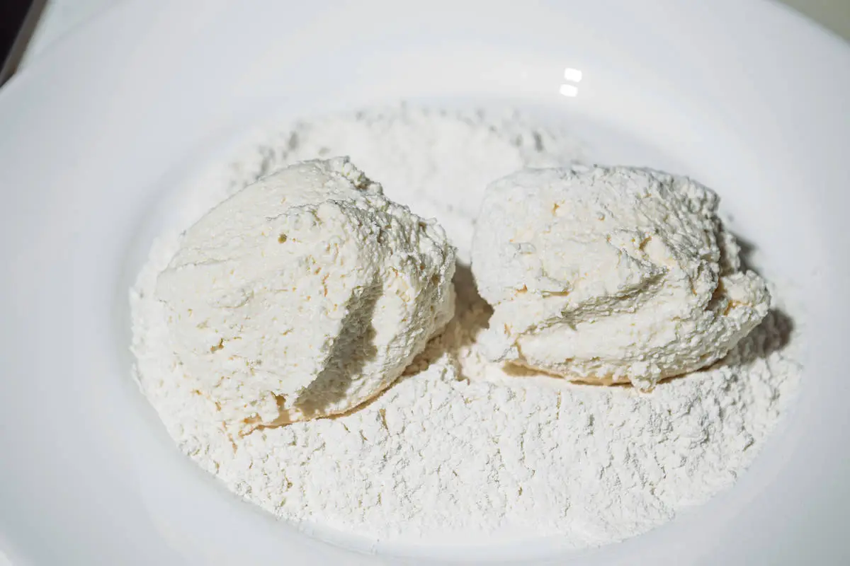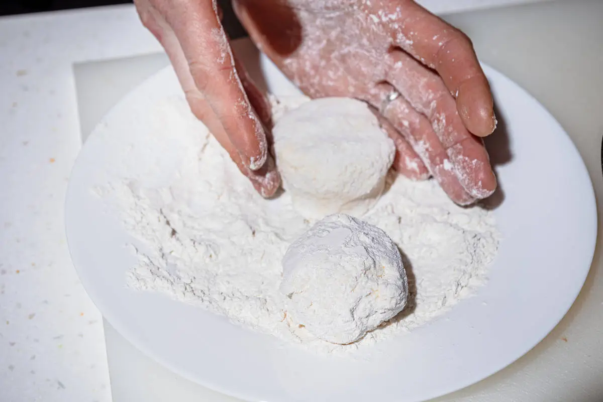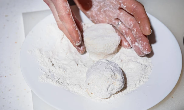 Муку насыпьте в тарелку. Сформируйте из творожной смеси шарики (удобно делать это с помощью двух ложек) и переложите в муку.