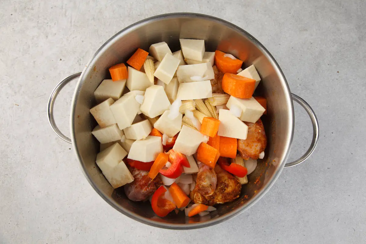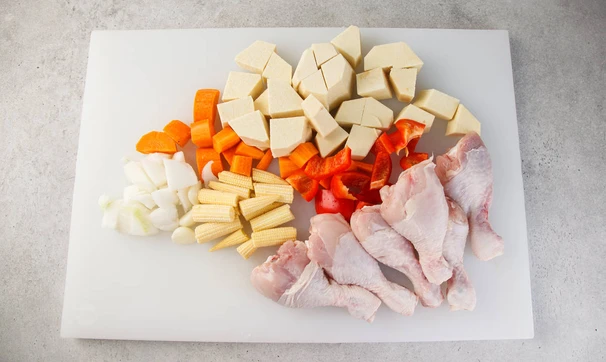 Ямс очистите и нарежьте крупными кубиками. Остальные овощи нарежьте средними кубиками, мини-кукурузу разрежьте пополам.