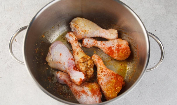 В большой кастрюле разогрейте оливковое масло и обжарьте куриные ножки со специями и солью.