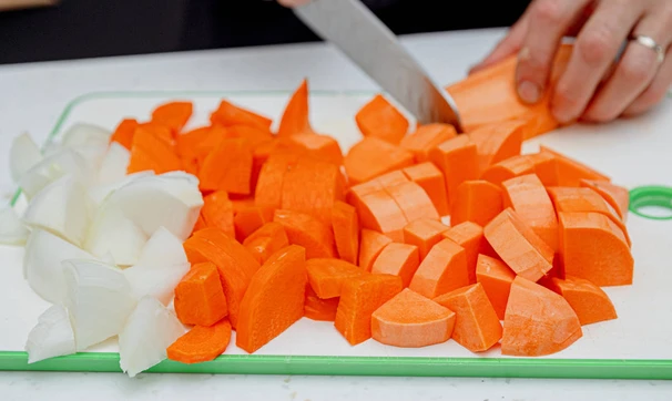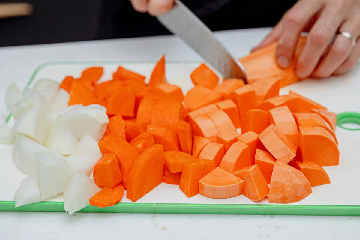 Лук, морковь и батат очистите и нарежьте толстыми четвертинками. У зубчика чеснока удалите сердцевину, нарежьте тонкими ломтиками.
