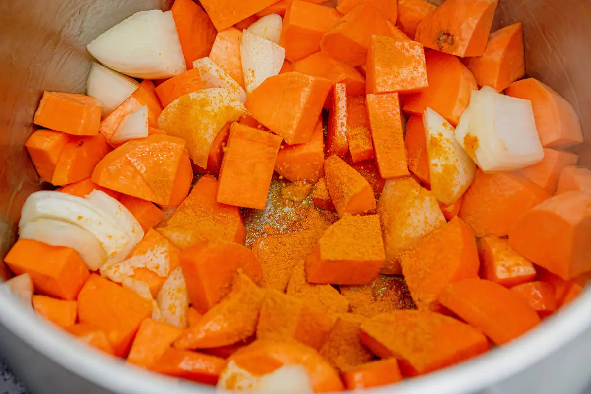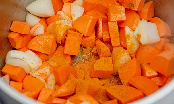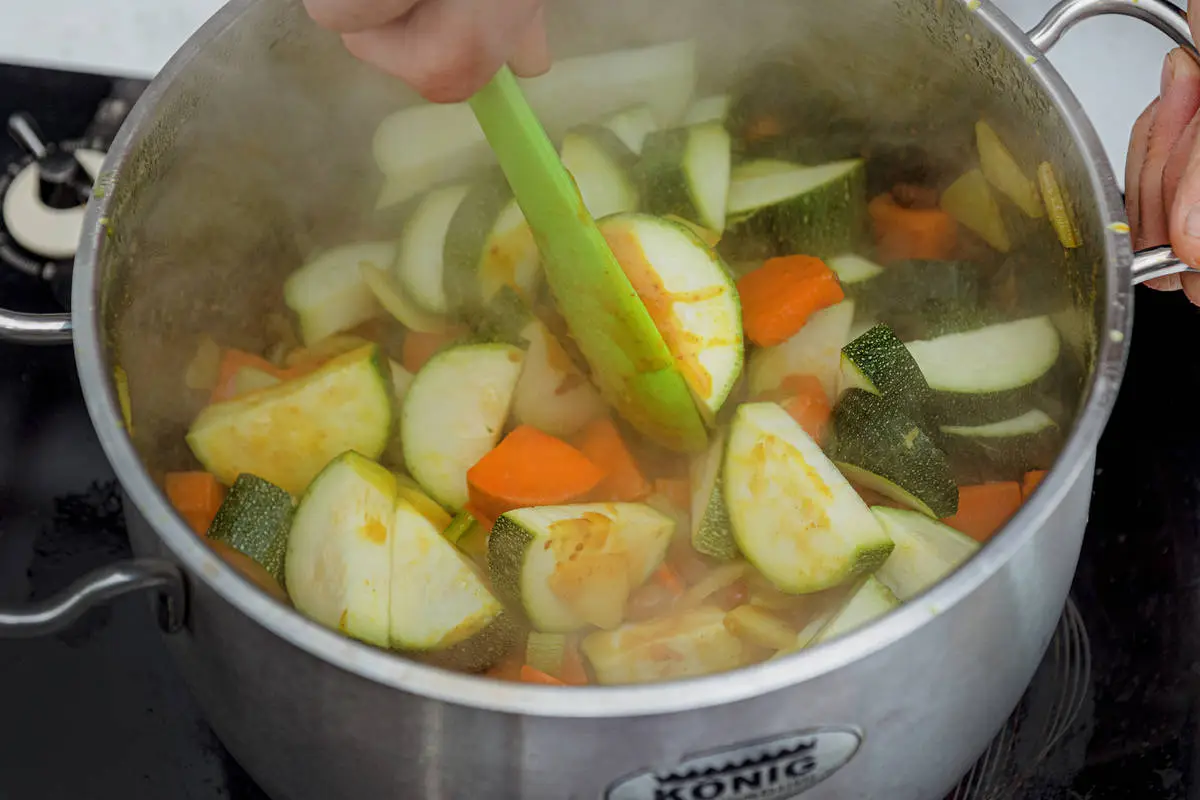 Обжарьте нарезанные овощи на растительном масле со специями в течение 15 минут.