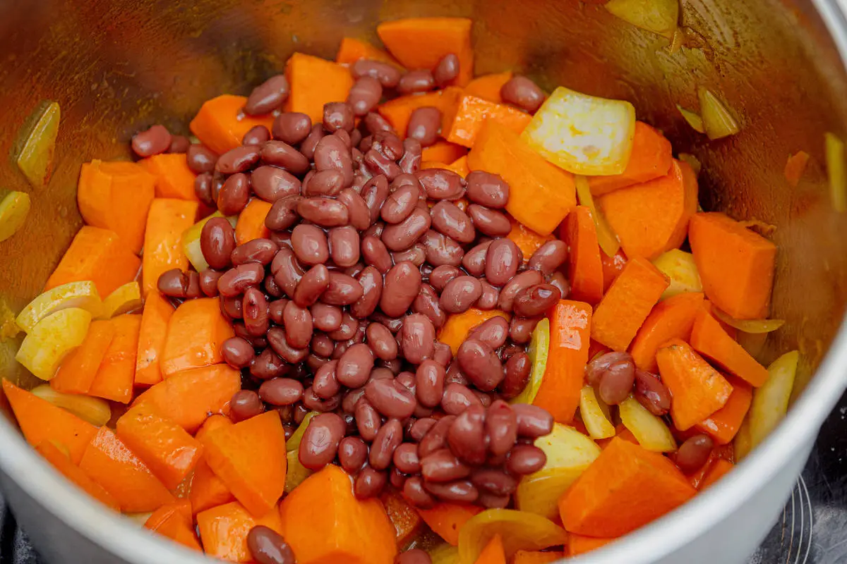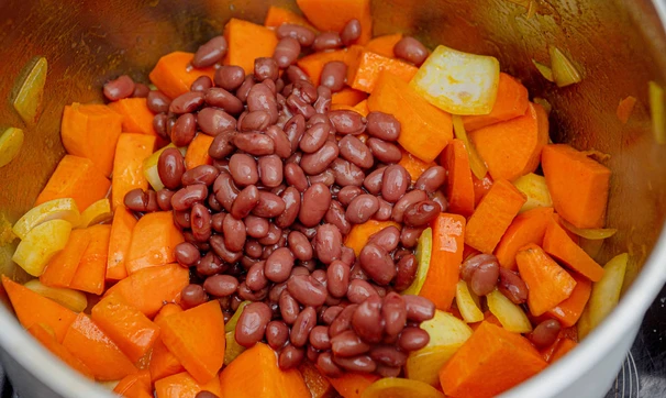 Вскройте банку с фасолью и вылейте содержимое в кастрюлю к овощам. Тушите ещё 5 минут.