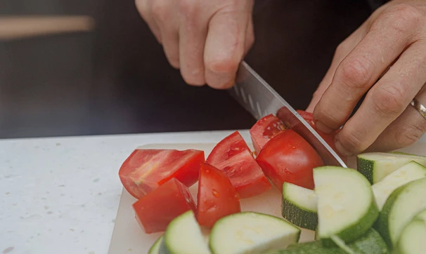 Цукини или кабачки нарежьте толстыми полукольцами, томаты — четвертинками.