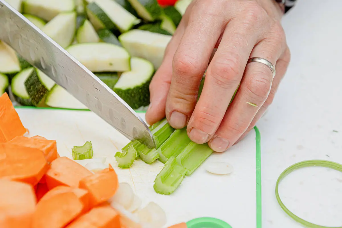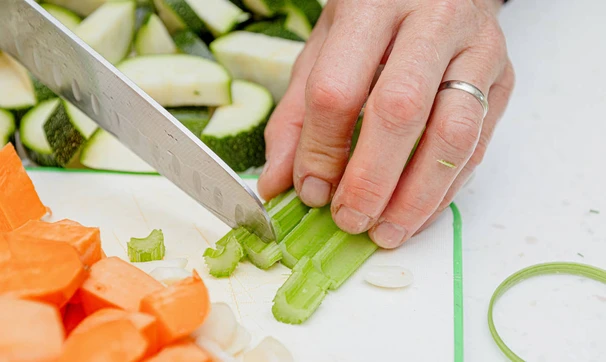 У черешка сельдерея удалите жёсткие жилки и нарежьте мелко.