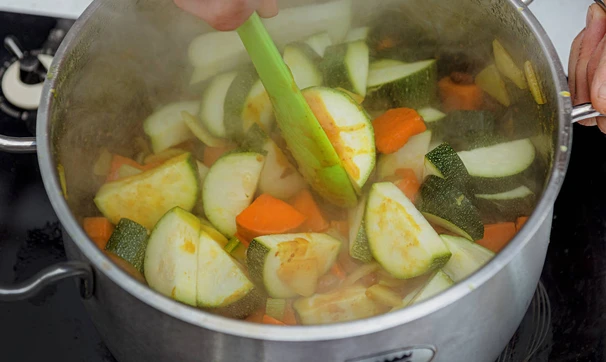 Добавьте цукини и сельдерей в кастрюлю, если суховато, влейте ещё 100 мл воды, тушите 5 минут.