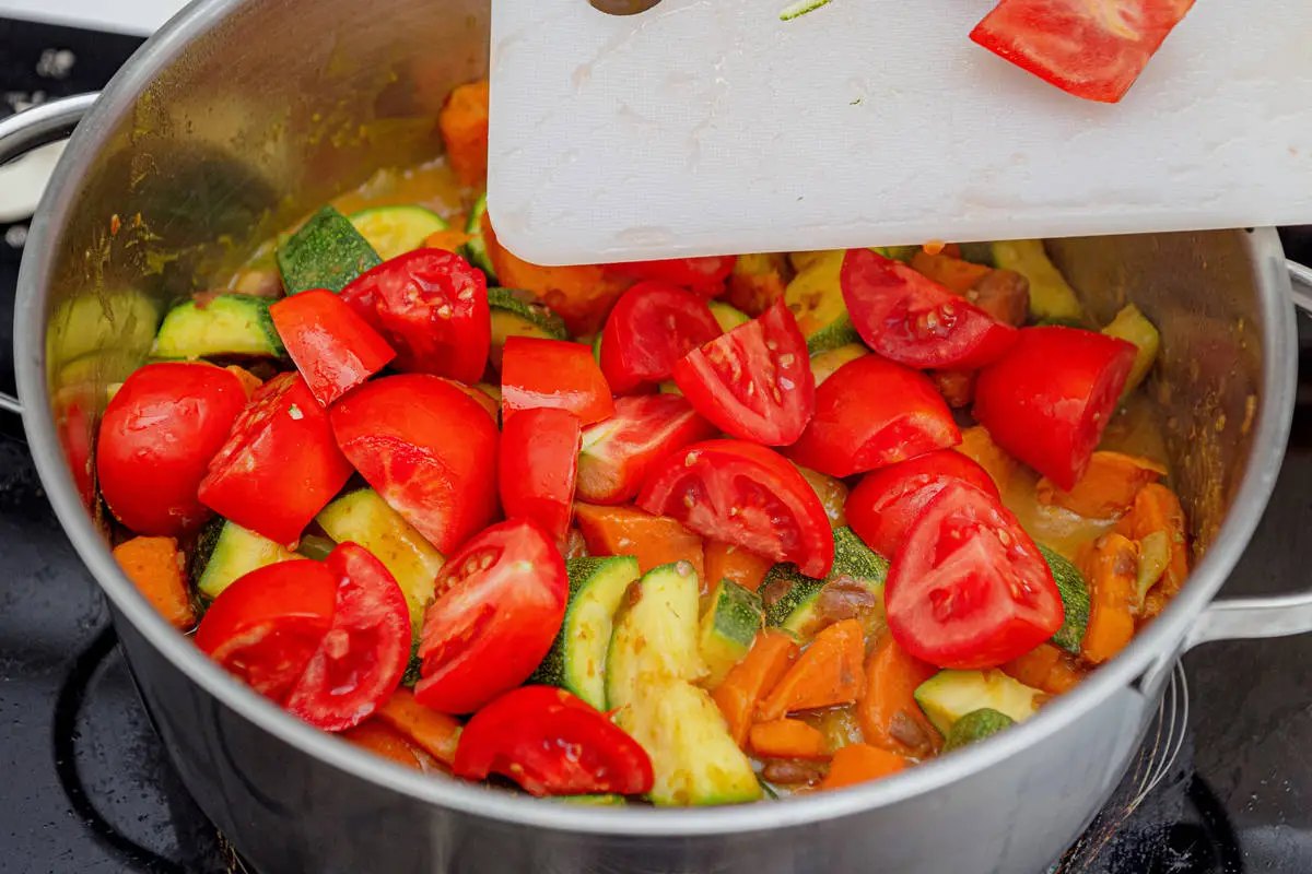Добавьте томаты и тушите ещё 5 минут, помешивая.