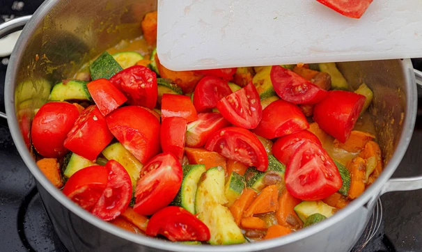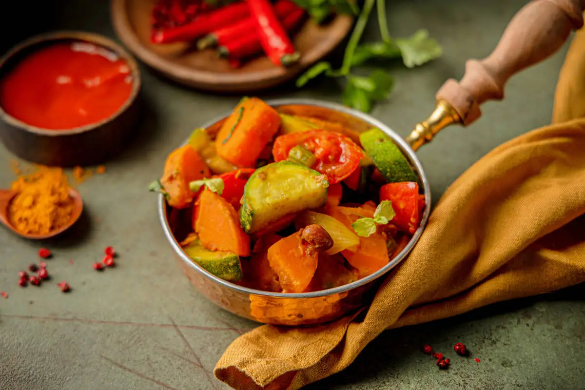 Яркое овощное рагу с пряным вкусом и восхитительным ароматом. При желании вы можете поэкспериментировать со специями, сделав блюдо острым с помощью перца чили, или добавив тимьян для обогащения вкуса и аромата. Но нам для данного овощного рагу понравилось именно такое сочетание.