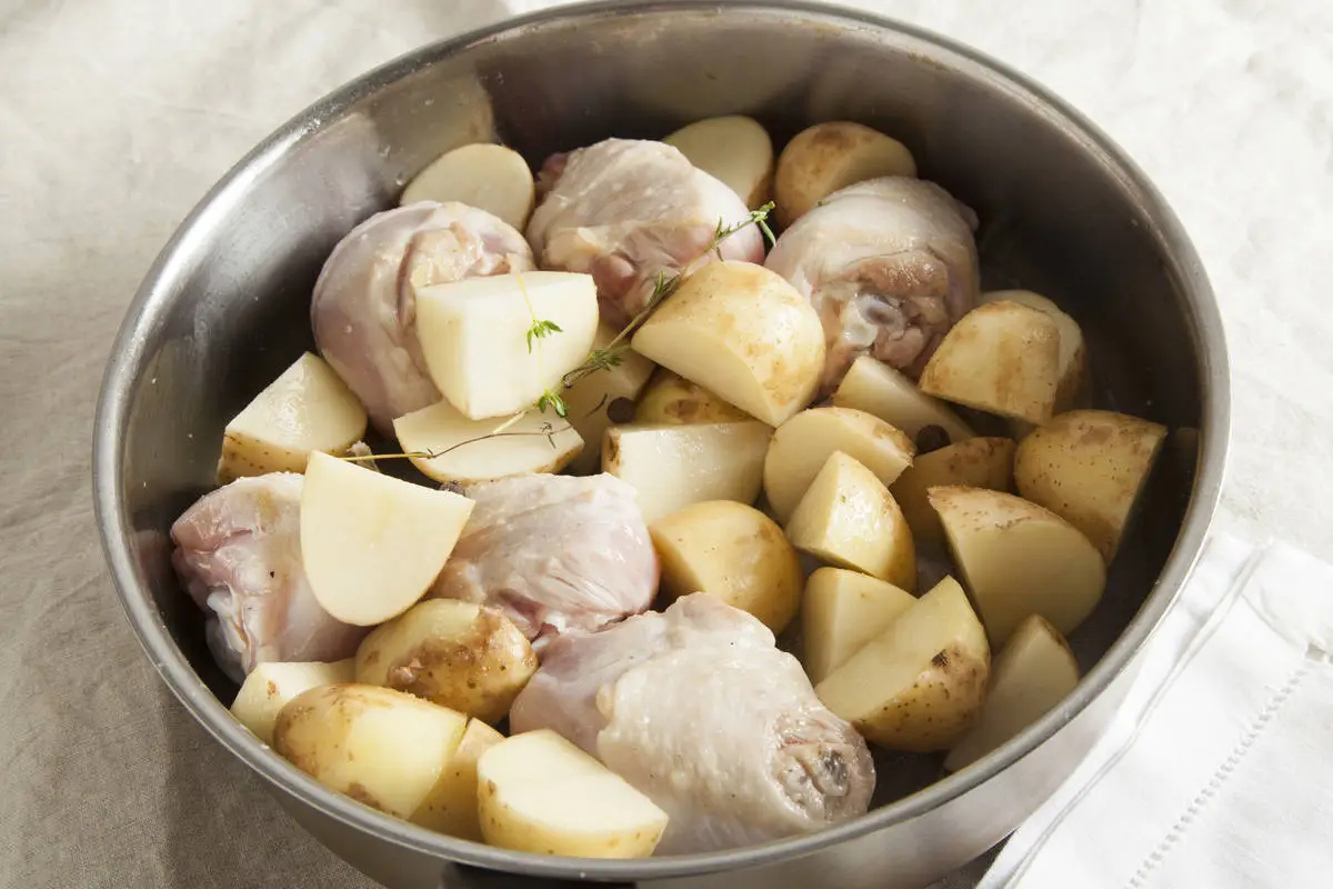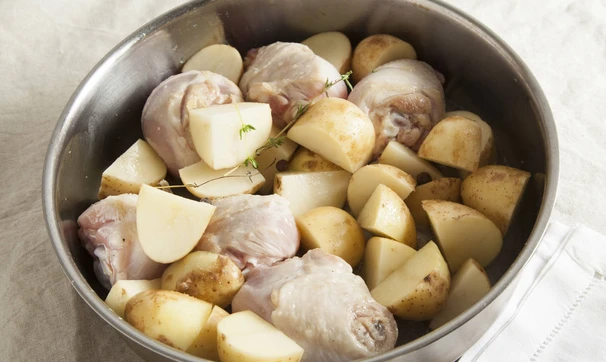 Куриное мясо слегка обжарьте в оливковом масле в сотейнике, добавьте картофель, чеснок и тимьян, посолите, влейте немного воды и тушите под крышкой почти до готовности картофеля.